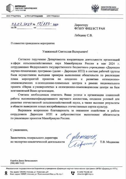 В июне 2024 года сотрудники Федерального государственного бюджетного учреждения "Дирекция научно-технических программ" провели выездную проверку выполнения обязательств по реализации плана мероприятий проектов, направленных на создание и развитие селекционно-семеноводческих и селекционно-племенных центров. Проверка проходила на базе Федерального научного центра биологических систем и агротехнологий Российской академии наук, возглавляемого доктором биологических наук, член-корреспондентом РАН, Лебедевым Святославом Валерьевичем.